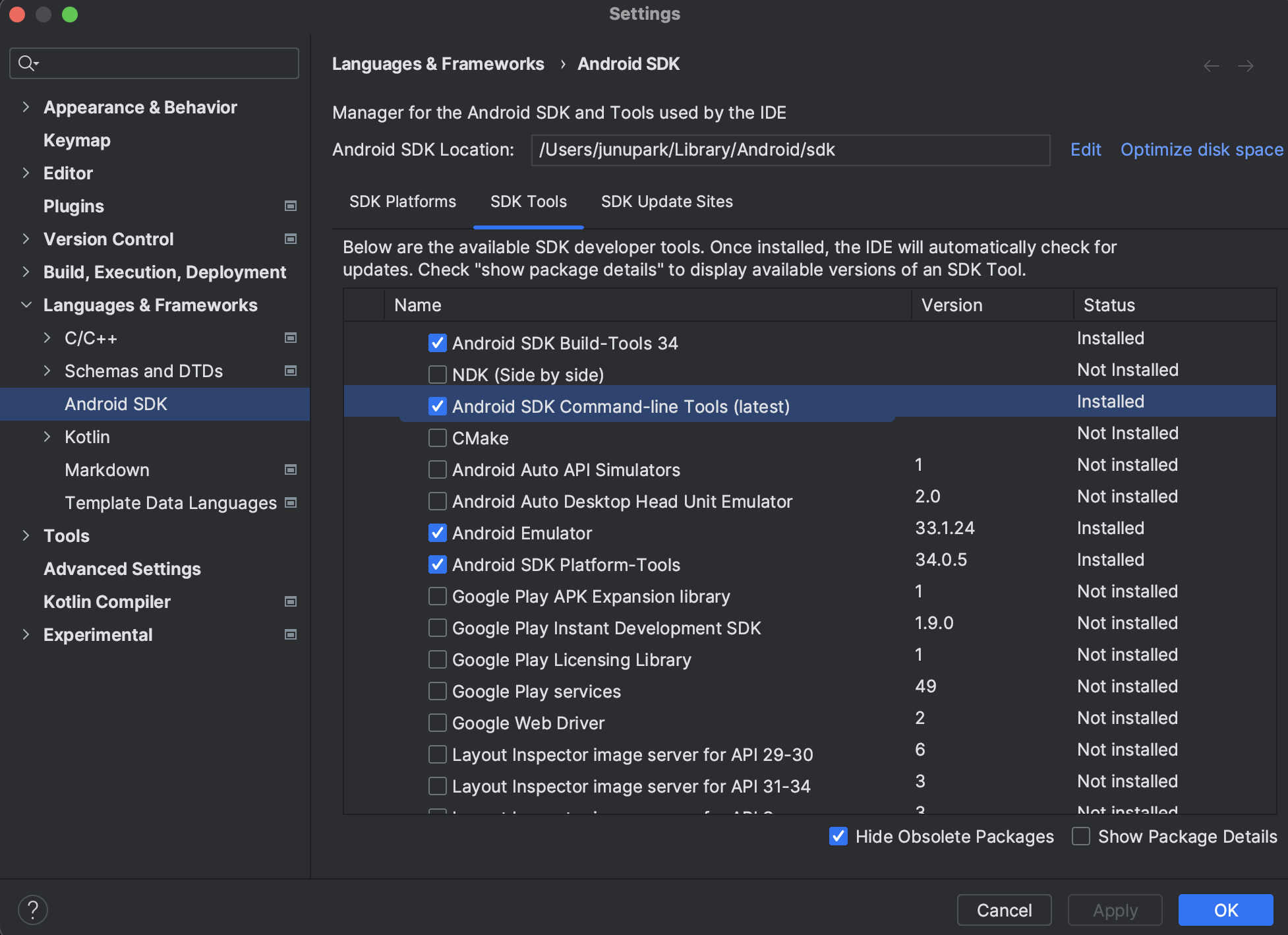 안드로이드 스튜디오 -> SDK Manager -> SDK Tools -> Android SDK Command-line Tools (latest) 설치